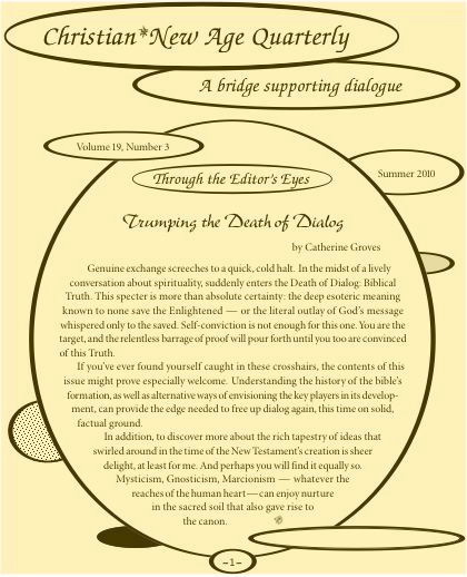 Readers of Christian*New Age Quarterly, including Father John W. Groff, Jr. and Michael E. Walker, contribute their thoughts on a range of subjects as well as discuss the articles that appeared in our Winter 2009 issue and Spring 2010 Plus supplement. An especially thoughtful analysis of Dr. Bruce G. Epperly's "The Secret Justice" featured in the Winter 2009 C*NAQ is offered by Wendell E. Wilkinson. |